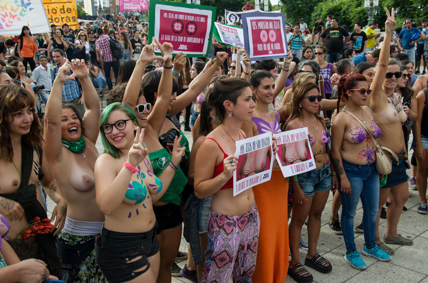 Entramos. El Monumento es una marea feminista. Hay de todo, claro, y están también quienes por la propia fuerza de la disidencia colectiva son echados. De nuevo, todo esto no es para los observadores que pretenden hacer del tetazo un producto sexualizado para su placer orgásmico, todo esto es por y para nosotras. En la multiplicidad de organizaciones y personas que acuden por su cuenta, aliadxs de la despatriarcalización y decolonización de los cuerpos, nos fundimos todxs en una misma oleada que pretende hacer del espacio público un territorio de lo vivible. La dinámica que tiene la confluencia de energías se pone en jaque a sí misma explicitando otras maneras de organizar el deseo. Pienso que asumirse desde la experiencia propia como nervio propulsor no implica concebirnos como cuerpos individualizados y despolitizados. Una chica se nos acerca irradiando un entusiasmo que enseguida se transforma en complicidad mutua. Quiero sacarme una foto con ustedes, nos dice. Miramos a la cámara mientras ella se acomoda en el medio. Me pongo acá así también muestro las tetas, agrega y se levanta la remera. Otra piba nos saca la foto. ¡Gracias! Dicen casi al unísono y se alejan mientras la primera vuelve a bajarse la remera para sentarse ambas en el lugar donde estaban.