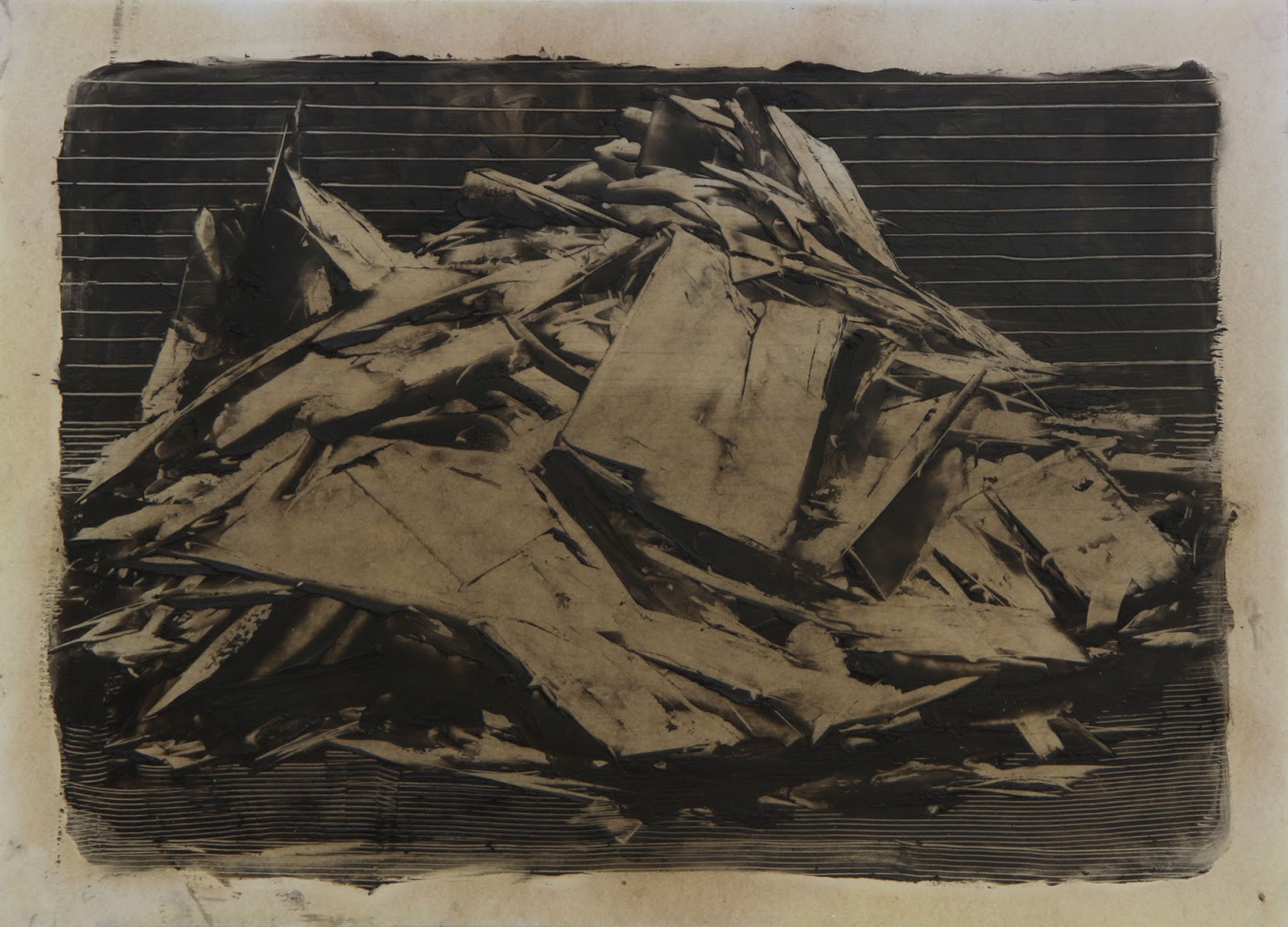 Y sin embargo, la experiencia estética está en sus preliminares. Los motores están calientes, ahora sí estamos listas para lo que sigue: advertir y aceptar que no hay fotografía. Ni siquiera hay dibujo ni pintura en sentido tradicional. El diseño del montículo de desperdicio que trasluce, por debajo, un cuerpo es un efecto producido por la distribución de grasas industriales sobre una superficie porosa. Un material que no pertenece al repertorio de materiales consagrados artísticamente, manipulado mediante peines y otros objetos, ha producido el efecto visual de aquello que creí ver, que me molestó ver, que acepté como cosa ahí, sin darme cuenta de que era yo quien lo proyectaba.