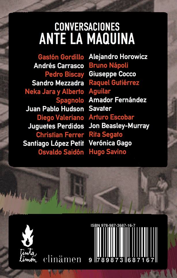 “En el libro está todo”, se dijo borgeanamente en la presentación de Conversaciones ante la máquina. Para salir del consenso desarrollista. Frase virtuosa por lo inespecífica: ¿qué es todo? ¿TODO? Pero el que habla sabe o lo sospecha y todo remite aquí a la totalidad de un dispositivo de intervención social, de experimentación política que (dis)funciona de modo bastante aceitado y del que este libro es tan solo una pieza, aunque dotada de un brillo singular.
