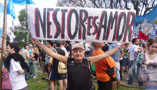 13. Una época signada por la figura humana “Néstor”, como el soporte de una multiplicidad de representaciones inconscientes, pactos y transacciones cruzadas, permitió que por efracción se anudaran nuestras subjetividades políticas como plenas, seguras, robustas, convencidas. Kirchner nos agarró cansados. Kirchner se volvió “Néstor” porque totemizó nuestra fuga: la sinergia libidinal, la descompresión de las energías rebeldes. Y mejor nos quedamos en casa (o en el partido, o en la orga). En el confort de nuestras convicciones previas: progres, marxianas, perucas.