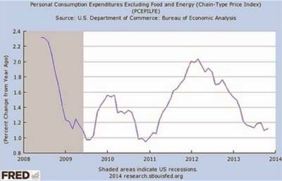 Los Estados Unidos tiene un colchón amortiguador de un poco más grande, pero no mucho. El crecimiento de dinero M2 se ha ralentizado aún más rápido de lo que lo hizo en los nueve meses anteriores a la caída de Lehman en 2008, pero la Fed no presta ya atención a dichos datos, por lo que puede repetir con demasiada facilidad el mismo error. La Fed está seguramente tanteando su suerte en cada reunión en la que retira $ 10 mil millones en bonos a pesar de la incipiente deflaión, como jefe de la Fed de Minneapolis Narayana Kocherlakota sigue advirtiendo.