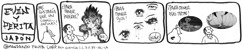 Evón y Perita está bajo licencia Creative Commons Reconocimiento-NoComercial- CompartirIgual 3.0 Unported License. Eso significa que estas tiras cómicas están disponibles para hacer cualquier cosa con ellas: publicarlas, distribuirlas, redibujarlas, tergiversarlas, cortarlas… Siempre que se haga sin fines de lucro, y siempre que el resultado se comparta con la misma licencia Creative Commons, en cualquier país del mundo y en cualquier rincón de Internet.