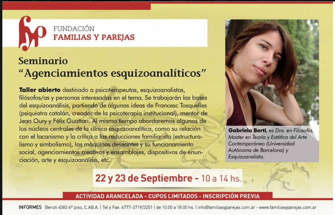 Los días 22 y 23 de septiembre (de 10 a 12hs), se llevará a cabo el seminario intensivo : Agenciamientos esquizoanalíticos, dirigido a psicoterapeutas, psicoanalistas, filósofxs y publico interesado (no se requieren conocimientos previos). Se trabajarán las bases del Esquizoanálisis según la propesta de Deleuze y Guattari, partiendo de las ideas de Francesc Tosquelles (psiquiatra catalán, mentor de Jean Oury y Félix Guattari). Se abordarán los núcleos centrales de la clínica esquizoanalítica, su relación con el lacanismo y las reducciones familiaristas (estructuralismo y simbolismo); máquinas deseantes y funcionamiento social; agenciamientos creativos y ensamblajes; dispositivos de enunciación; la relación arte y esquizoanálisis.
