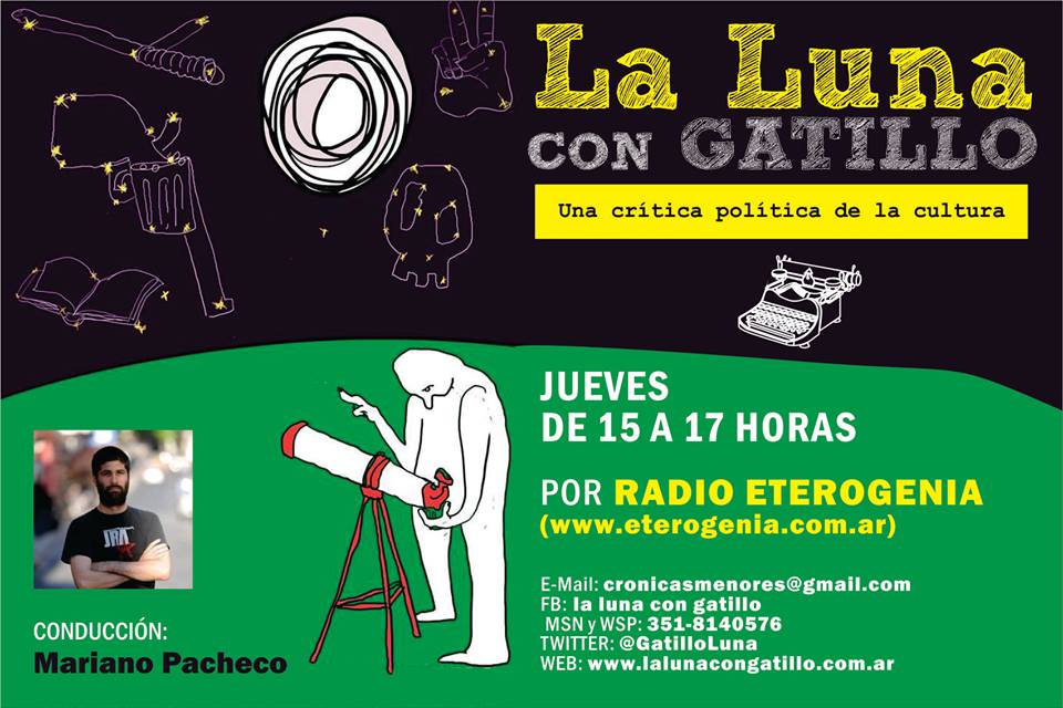 La luna con gatillo se emite todos los jueves, de 15 a 17 horas por www.eterogenia.com.ar, la radio del Centro Cultural España-Córdoba. Trinchera radiofónica conducida por Mariano Pacheco y Carlos Bergliaffa, que cuenta con el colectivo integrado por Carla Lorena Lorenzo en redes sociales; “El Turco” Diego Abu Arab en gráfica, “El Pelado” Pablo Rodríguez en producción artística y Dante De Noia en la operación técnica.