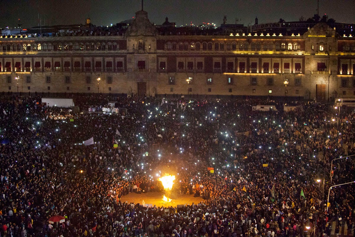 La caravana con familiares que recorrieron el sur del país llega al Zócalo. desde el templete, sus integrantes dicen: «México está cansado de la situación del país. Ya no se van a permitir desapariciones ni asesinatos extrajudiciales. No es un berrinche realizar manifestaciones en todo el país. No es un berrinche buscar a 43 (estudiantes), ni repudiar el ataque sufrido por los normalistas el 26 de septiembre. Tampoco es un berrinche que miles de madres y padres sigan buscando a sus hijos».