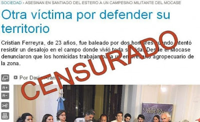 El viernes, en la crónica sobre el asesinato de Ferreyra, ultimado por matones contratados por un empresario, Página/12 eliminó sin consultar al periodista ni retirar su firma el único párrafo que aludía con nombre y apellido al gobernador de Santiago del Estero. Aranda había escrito que Zamora se definía como un «radical K», que denominó a la provincia como «capital nacional del kirchnerismo», que no había respondido a los llamados del diario ni se había pronunciado sobre el asesinato y que el MoCaSE consideraba su política de represión al campesinado como «la continuidad del juarismo», datos que no llegaron a los lectores.