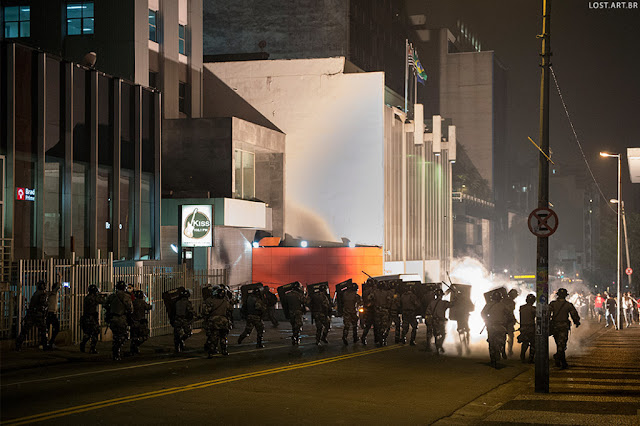 En la fatídica noche del pasado jueves 13 de Junio, São Paulo quedó envuelta por una nube de gas lacrimógeno y su piel marcada por las balas de goma. La ciudad más grande de América Latina, la “locomotora de Brasil”, vio como más de diez mil personas salían a la calle a demostrar su insatisfacción por una serie de cuestiones, que van mucho más allá del mero aumento del precio del pasaje del transporte público –que subió de R$ 3.00 a R$3,20 la última semana-. Fue la cuarta gran manifestación en la ciudad, organizada por el Movimiento Passe Livre (MPL), en protesta por los precios abusivos del transporte público. Tuvimos una noche de jueves llena de escenas casi de guerra –la militarización del centro de la ciudad fue una realidad-, con un balance de más de 250 detenidos y cerca de 50 heridos, entre ellos siete reporteros de Folha de São Paulo, el periódico de mayor circulación de la ciudad.