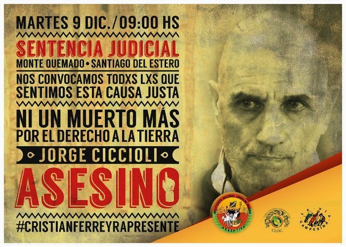 El tribunal oral de primera nominación de Santiago del Estero liberó de culpa y cargo a Jorge Ciccioli, el empresario acusado de ser el autor intelectual del asesinato del campesino Cristian Ferreyra, quien recibió un disparo de escopeta al resistir un desalojo en sus tierras. Los jueces condenaron a 10 años de prisión al autor material del crimen, Javier Juárez. El Movimiento Campesino de Santiago del Estero protesta frente al juzgado.